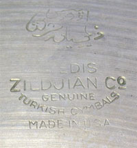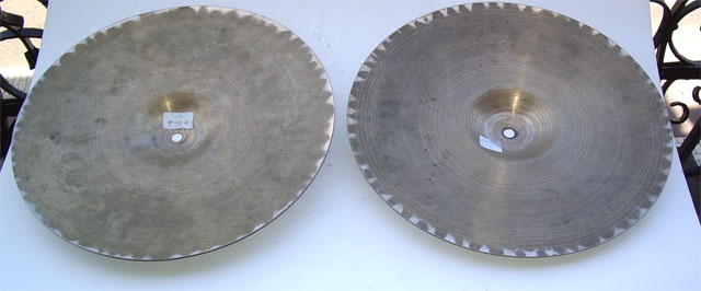 | 1940s / 1950s 13 inch '50s hi-hat cymbals, the bottom cymbal is just a little bit heavier than the top. Both cymbals are thin, the top is almost peperthin, both are easily bendable. The holes are a little smaller than todays sizes. There are lots of fingerprints, greenish spots and nice golden brown patina has formed over the years. NO cracks, hardly any keyhole. |
